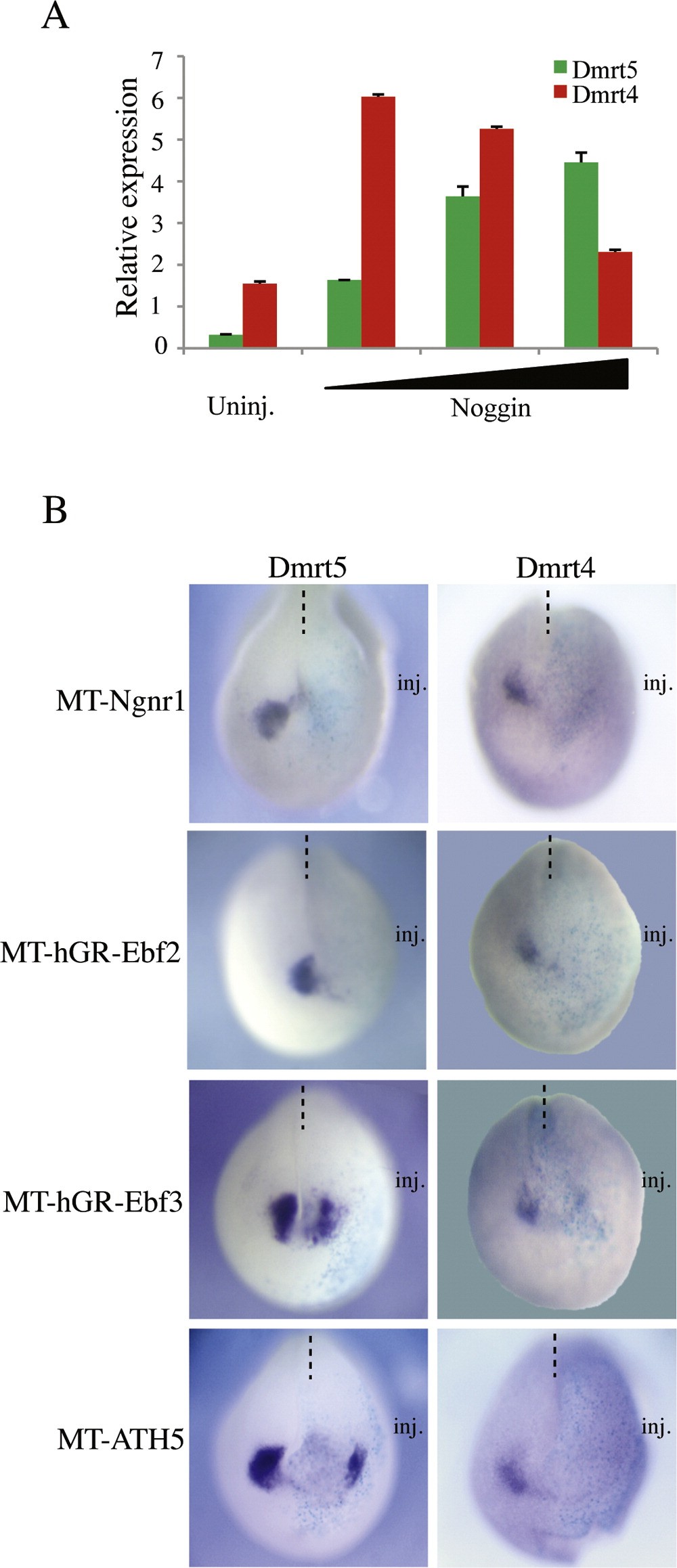Fig. 3. Dmrt5 is upregulated by attenuation of BMPs and downregulated by overexpression of the proneural factors Ngnr1, Ebf2, Ebf3 and Ath5. (A) Real time RT-PCR analysis of animal cap explants isolated from embryos injected with increasing doses of Noggin mRNA (40 pg, 100 pg and 400 pg) and collected at stage 17. Note that Dmrt5 expression is activated by higher doses of Noggin mRNA as compared to Dmrt4. Each value has been normalized to the level of GAPDH expression. (B) Overexpression of MT-Ngnr1, MT-hGR-Ebf2, MT-hGR-Ebf3 and MT-Ath5 (400 pg) blocks Dmrt5 and Dmrt4 in the embryo. Anterior views of whole-mount in situ stained embryos are shown, with dorsal to the top. In all cases, LacZ mRNA was used as a lineage tracer to identify the injected side. |