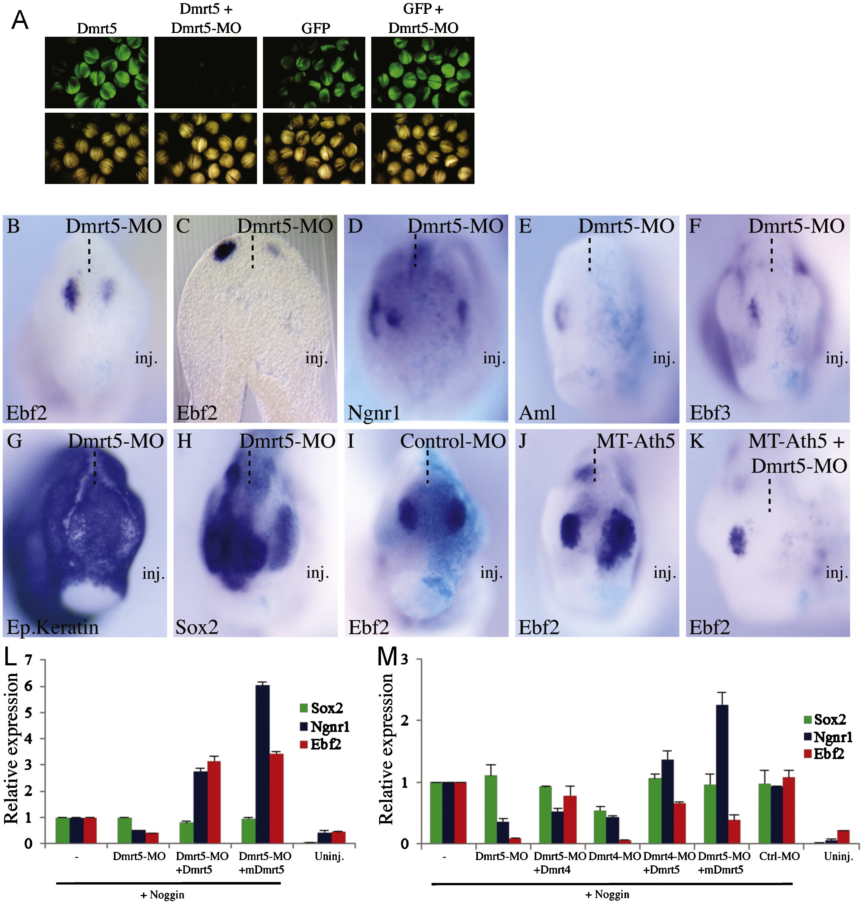 Fig. 5. Knockdown of Dmrt5 reduces Ngnr1 and Ebf2 expression. (A) In vivo translation of a Dmrt5-eGFP reporter construct is specifically inhibited by the Dmrt5-MO. Embryos were injected with 500 pg of Dmrt5-eGFP mRNA or, as a control, 500 pg of eGFP mRNA, alone or in combination with 20 ng of the Dmrt5-MO, as indicated. (B)I) Whole-mount in situ hybridization of early tadpole embryos injected with 20 ng of Dmrt5-MO or a control standard MO and analysed with the indicated probes. (B) and (D)I) Anterior views with dorsal to the top. (C) Horizontal section through the head, anterior to the top. The injected side marked by Xgal staining in light blue is on the right. Note that Dmrt5 morphants show reduced Ngnr1, Ebf2, Aml and Ebf3 expression in the olfactory epithelium while Ep.Keratin and Sox2 expression is unaffected. Injection of a control MO has no effect on Ebf2. (J) and (K) Anterior views of early tadpole stage embryos injected with Ath5 mRNA, with or without 20 ng of DMRT5-MO and hybridised with Ebf2. Note that Ebf2 is expanded in Ath5 injected embryos and reduced in Ath5 overexpressing Dmrt5 depleted embryos. (L) and (M) RT-qPCR analysis of Sox2, Ngnr1 and Ebf2 expression in animal caps derived from embryos injected with Noggin (100 pg), Xenopus MT-Dmrt5 (50 pg), mouse MT-Dmrt5 (mMT-Dmrt5, 50 pg), Xenopus MT-Dmrt4 (xDmrt4, 50 pg), Dmrt4-MO (20 ng) and Dmrt5-MO (20 ng), as indicated. Expression levels were normalized to GAPDH and compared to the level observed in Noggin injected caps, which was set to 1. Note that Noggin-mediated activation of Ngnr1 and Ebf2, but not that of Sox2, is blocked in caps derived from Dmrt5 or Dmrt4 depleted embryos and that their absence can be indifferently rescued by Dmrt5 or Dmrt4 overexpression.