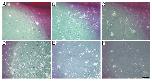 Figure 1. Defective in vitro expansion of cybrids cells. The concentration of control haploid [l]xl embryonic cells (A-C) in a given area of a culture dish visibly increased over time, while that of [l]xt cybrid cells (D-F) did not. Pictures in (B, E) and (C, F) were taken 5 and 13 d, respectively, after those in (A, D). Scale bar: 0.1 mm.