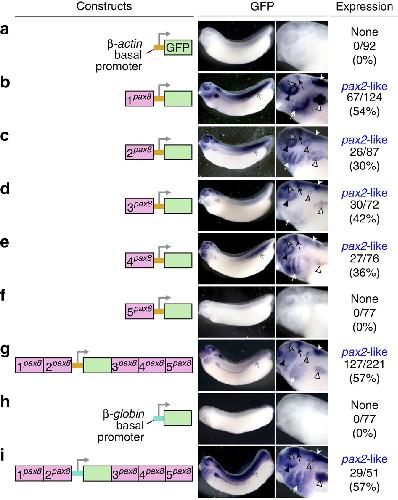 Figure 2: GFP expression driven by pax8-CNSs recapitulates the pleiotropic expression of pax2. Transgenic X. laevis embryos were generated with the following reporter constructs and their expression was analysed using in situ hybridization. (a) The β-actin basal promoter alone was linked to GFP. (bâf) The β-actin promoter-GFP cassette was flanked by either X. tropicalis pax8-CNS1 (b), pax8-CNS2 (c), pax8-CNS3 (d), pax8-CNS4 (e) or pax8-CNS5 (f). (g) The β-actin promoter-GFP cassette was flanked by all the pax8-CNSs. (h) The β-globin basal promoter alone was linked to GFP. (i) The β-globin promoter-GFP cassette was flanked by all the pax8-CNSs. The X. tropicalis pax8-CNS1 to pax8-CNS5 are shown as 1pax8 to 5pax8. Representative examples of GFP expression are shown together with the injected reporter constructs. The right-hand panels show high-magnification views of the embryonic head regions illustrated in the left-hand panels. GFP expression patterns are summarized on the extreme right with the scoring results. Numbers of embryos with the positive expression similar to the representative examples, and the total number of analysed embryos injected with each construct are indicated with percentages of the former cases. White, grey and black triangles indicate expression in the pronephros, otic vesicle and eye, respectively. White, grey and black arrows indicate expression in the pharyngeal arches, somites and MHB, respectively. White and grey arrowheads indicate expression in the hindbrain and anteriormidbrain, respectively.
