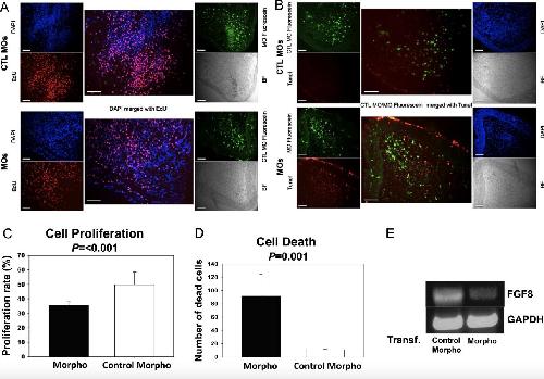 Fig. 5. Transfection of PL1 and PL2 MOs in the regenerating forelimb blastemas affects cell proliferation and cell death. MO transfection was performed at 7 day pa with PL1/2 MOs injected in one forelimb of an animal and the control MOs in the other forelimb of the same animal, respectively. Limb regenerate tissues were collected another 7 days after MO transfection. To provide a baseline control, the total RNA extracted from limb tissues harvested on day 0 during limb amputation was also subjected to RT qPCR: (A) Examination of proliferation by detection of EdU incorporated into genomic DNA. (B) TUNEL staining of limb blastemas. Scale bars=200 μm. (C, D) Statistical analysis of the effect of PL1 and PL2 knockdown on cell proliferation and cell death during limb regeneration. The percentage of proliferating cells was determined by the ratio of EdU-labeled cells in the population of DAPI-stained cells. We counted the absolute numbers of dead cells stained in red in the TUNEL assay to assess cell death rate. Error bars indicate the mean ±SD, n=7â8 per group (n=7â8 refers to tissue section slides, and the tissue sections were derived from three animals). (E) Axolotl PL1 and PL2 MO transfection led to decreased expression of FGF8 in the regenerating axolotl limbblastema. MOs were injected into one of the regenerating forelimb blastemas (5 dpa) while the control MOs were injected into the other forelimbblastema of the same animal. Seven days after transfection, limb blastemas were collected and total RNA was extracted for RT-PCR analysis. The tissue sections used for the quantitation analysis shown in panels C and D, and for the images shown in panels A and B were obtained from two separate experiments.