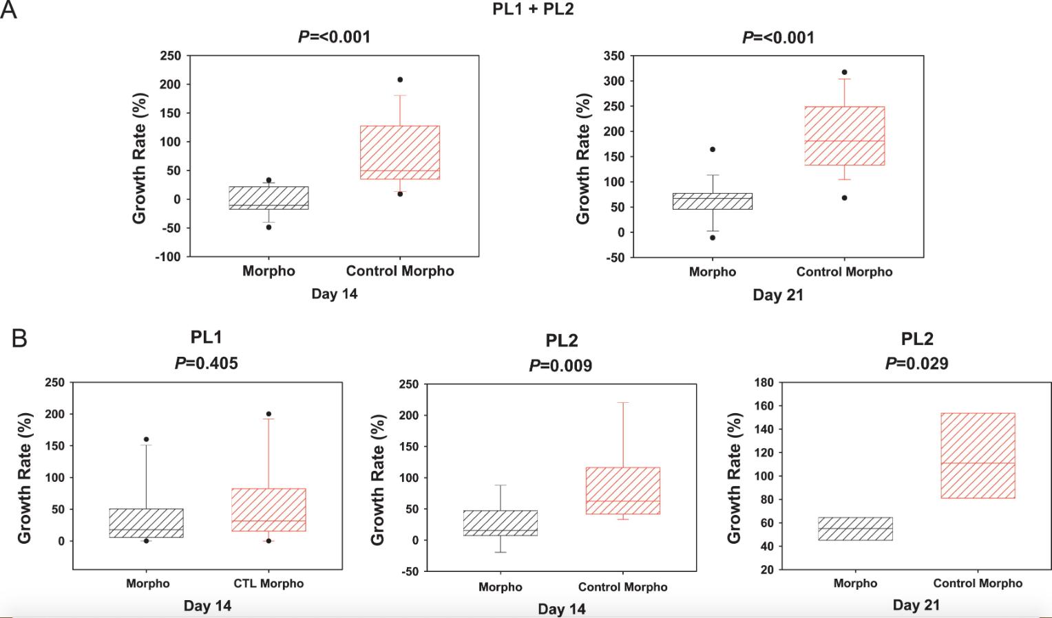 Fig. 4. Effect of PL1 and PL2 knockdown mediated by morpholino oligos (MO) on axolotl limb regeneration: (A) Evaluation of limbblastema growth rate by PL1 and PL2 MO transfection in limb regenerates. Length of limb blastemas was measured at days 14 and 21 after the first transfection to determine whether there was a differential pace of limb regeneration in the presence of PL1 and PL2 MOs. Results are compiled from four different experiments. 17 animals were used. P values are presented in the graph (PL1 and PL2 MOs, n=17; control MOs, n=17). (B) Effect of PL1 or PL2 individual knockdown in the growth rate of limb blastemas. The result for day 14 was obtained from two different experiments. In total 10 (for PL1) or 9 (for PL2) animals were used. The result for PL2 on day 21 was obtained from one experiment in which two animals were used. P values are presented in the graphs (PL1 and PL2 MO and control MO, n=10; PL2 day 14, MO and control MO, n=9; PL2 day 21, MO and control MO, n=4).
