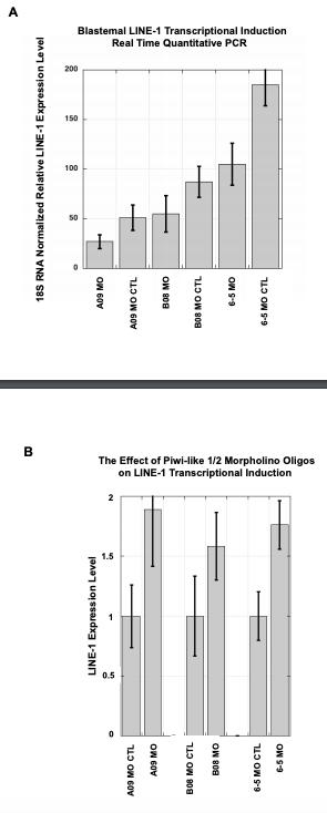 Supplementary Fig. S3 LINE-1 cDNA Real Time qPCR examination of the effect of PL1/2 MOs on LINE-1 transcriptional upregulation during axolotl limb regeneration. PL1/2 MOs or control MOs were injected into the two forelimbs, respectively in the same animal 7 days pa. Electroporation was performed afterwards immediately to facilitate tissue transfection of the oligos. 7 days after MO injection, limb blastemas were collected and total RNA was extracted for RT qPCR. Limb tissues harvested on day 0 during limb amputation were also subjected for total RNA extraction and RT qPCR. Quantitative PCR was performed using Applied Biosystemsâ Power SYBR Green system. A09 and D08 are the two sets of qPCR primers for LINE-1 ORF1, while 6-5 is for LINE-1 ORF2. t: days after limb amputation. The housekeeping gene, 18S RNA was used for