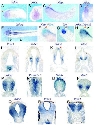 Fig. 2. Expression pattern of Xdtx1. The probes used are indicated on the top of each panel. (AâH) Whole-mount in situ hybridizations. (A,B) Stage 26: lateral view, anterior to the left (A) and frontal view, dorsal to the top (B). (CâH) Stage 32: lateral views, anterior to the left (C,FâH), frontal view, dorsal to the top (D) and dorsal view, anterior to the left (E). (IâP) Transversal sections of whole-mount processed embryos at stage 32. Sections from (I) to (M) are progressively ordered along the rostro-caudal axis, as shown in (E), and correspond to telencephalon (I), anteriordiencephalon (J), posteriordiencephalon (K), hindbrain (L) and spinal cord (M). (NâP) Spinal cord sections. (QâS) Transversal sections of whole-mount processed embryos at stage 40 corresponding to telencephalon (Q), diencephalon (R) and hindbrain (S). hy, hypothalamus. The red arrowheads point to the pineal complex while the black arrowhead indicates Xpax2 expression at the midbrainâhindbrain boundary.