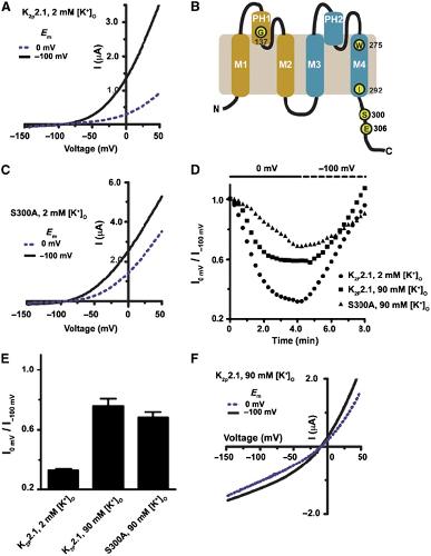 Figure 1. Extracellular potassium antagonizes regulation of K2P2.1 (TREK-1) by membrane potential. (A) Effect of membrane potential (EM) on K2P2.1 (TREK-1) activity in Xenopus laevis oocytes measured by two-electrode voltage clamp in 2 mM [K+]o pH 7.4. Current–voltage (I-V) curves show exemplar voltage-clamp recordings of K2P2.1 (TREK-1) activity after 4 min of holding at −100 and 0 mV, consecutively. (B) Cartoon diagram of a single K2P2.1 (TREK-1) subunit, transmembrane segments 1–4 (M1–M4), pore helix 1 and pore helix 2 (PH1, PH2), and the positions of key residues are indicated. (C) Exemplar I–V curves showing the effect of EM on K2P2.1 (TREK-1) S300A. (D) Channel activity from a representative cell in response to changes in EM. Channel activity was assayed every 15 s by a ramp from −150 to 50 mV. Following current stabilization at −100 mV, EM was changed to 0 mV, and channel activity was assayed by the ramp protocol until current reached minimal values (usually within 4–5 min). Channel activity was reversed by returning EM to −100 mV. Each point represents channel activity from the ramp curves at 0 or +50 mV for 2 mM and 90 [K+]o solutions, respectively. Data presented as fraction relative to activity after initial stabilization at −100 mV. (E) Quantification of maximal inhibition of WT or mutant K2P2.1 (TREK-1) by prolonged incubation at 0 mV (mean±s.e., n⩾6, N⩾2, where ‘n' is the number of oocytes and ‘N' in the number of independent oocyte batches). (F) I–V curves showing exemplar voltage-clamp recordings of K2P2.1 (TREK-1) in 90 mM [K+]o pH 7.4 after stabilization at, consecutively, −100 and 0 mV. |