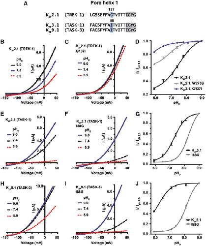 Figure 2. PH1 is critical for K2P channels C-type gating. (A) Amino-acid alignment of the PH1 region of the indicated K2P channels. The GXG selectivity filter sequence is highlighted in grey. (B, C, E, F, H, I) Exemplar recordings of the response of the indicated K2P channels to the external pH (pHo) changes in 2 mM [K+]o solution. Currents were elicited by a voltage ramp from −150 to +50 mV, from a holding potential of −80 mV. (D, G, J) Quantitation of the response of the K2P channels to changes in pHo. Data (mean±s.e., n⩾6, N⩾2) was taken at 0 mV, normalized to activity at pH 9.0, and fitted to the Hill equation. |