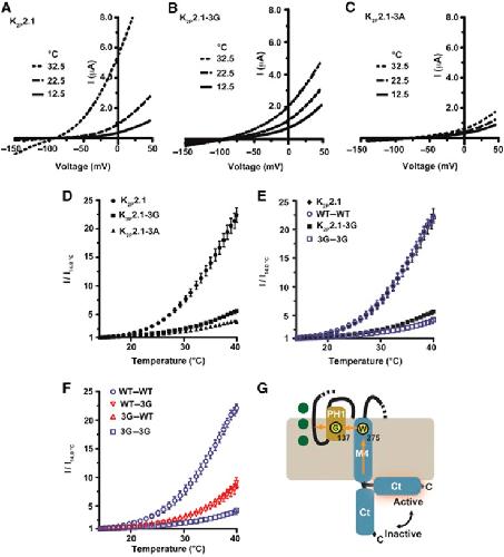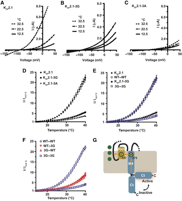 Figure 6. Both C-terminal domains are required for the K2P2.1 (TREK-1) temperature response. (A–C) Exemplar two-electrode voltage clamp recordings of K2P2.1 (TREK-1) (A), K2P2.1-3G (B), and K2P2.1-3A (C) responses to temperature in 2 mM [K+]o pH 7.4. Currents were elicited by a ramp from −150 to +50 mV, from a −80 mV holding potential. (D–F) Quantification of the temperature responses. Data (mean±s.e., n⩾6, N⩾2) was taken at 0 mV and normalized to channel activity at 14°C. (G) Cartoon model of how Ct couples to the C-type gate of K2P2.1 (TREK-1). M4, transmembrane segment 4. Channel elements come from a single subunit. Transmembrane segments M1–M3 and pore helix 2 are not depicted. Dashed regions indicate connections to parts of the subunit that are not shown. Green circles represent potassium ions in the selectivity filter. |