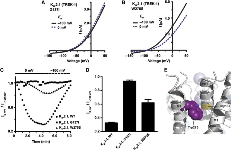 Figure 3. Mutations that stabilize the C-type gate antagonize regulation of K2P2.1 (TREK-1) by membrane potential. (A, B) Exemplar recordings from oocytes expressing the indicated K2P2.1 (TREK-1) mutants after prolonged incubation at, consecutively, â100 and 0 mV in 2 mM [K+]o pH 7.4. After current stabilization at â100 mV, the membrane potential was changed to 0 mV, and the current was recorded every 15 s using a voltage ramp from â150 to +50 mV. (C) Exemplar time resolution of channel activity from a representative cell in response to fluctuating EM in 2 mM [K+]o pH 7.4. Each point represents channel activity from the ramp curves at 0 mV. Data presented as fraction relative to activity after initial stabilization at â100 mV. (D) Quantification of maximal K2P2.1 (TREK-1) inhibition by prolonged incubation at 0 mV (mean±s.e., n⩾6, N⩾2). (E) Ribbon diagram showing the location of Trp275 and Gly137 of K2P2.1 (TREK-1) on the crystal structure of K2P4.1 (TRAAK) (Brohawn et al, 2012)(PDB ID 3UM7). M4, transmembrane helix 4. PH1, pore helix 1. Blue spheres depict potassium ions. |