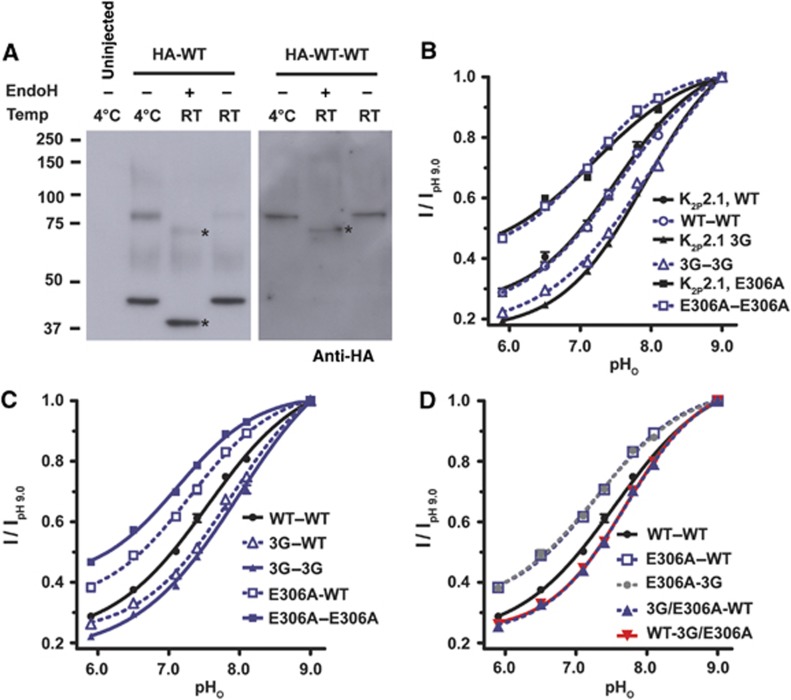 Figure 5. Ct domains act cooperatively to affect K2P2.1 (TREK-1) function. (A) Immunoblot analysis of lysates from oocytes expressing HA-tagged WT, HA-WT or tandem HA-WT-WT K2P2.1 (TREK-1) channels. Lysates were pre-incubated with or without EndoH for 1 h at 4oC or at room temperature (RT). Before electrophoresis, all samples were treated with 2% SDS and 2% β-mercaptoethanol for 15 min at 50oC to dissociate K2P2.1 (TREK-1) subunits. Asterisks denote deglycolyslated forms of WT and tandem channels. (B–D) Normalized responses of the indicated K2P2.1 (TREK-1) channels to pHo changes 2 mM [K+]o. Currents were elicited by a voltage ramp from −150 to +50 mV, from a holding potential of −80 mV. Data (mean±s.e., n⩾6, N⩾2) was taken at 0 mV, normalized to activity at pH 9.0 and fitted to the Hill equation. |