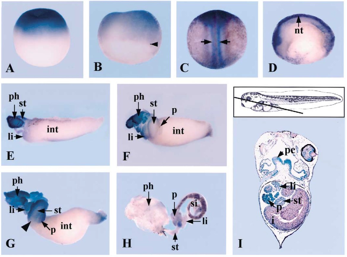boundary (arrowhead). (H) Fully differentiated stage 49 gut. No positive signaling is detected at this stage. (I) A frontal section of the stage 42 tadpole shows