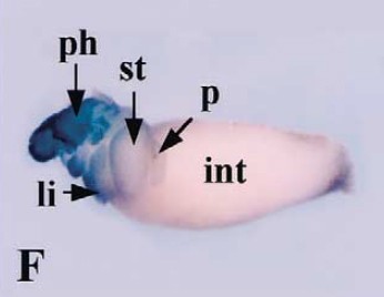 (ph) and foregut including liver (li), pancreas (p), and stomach (st). The posterior expression boundary of Xamp expands to the transitional zone/intestine
