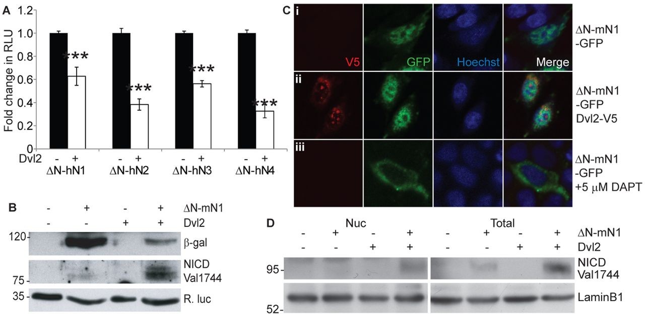 Fig. 3. Dishevelled does not inhibit Notch cleavage or the nuclear translocation of NICD. (A) mDvl2 inhibits all four human Notch paralogues. CHO-K1 cells were transfected with RBPJκ-Luc and pRL-CMV. Notch signalling was initiated by expressing active forms of each human Notch paralogue (δN-hN1-4) in the presence or absence of mDvl2. Data are presented as mean fold change (±s.e.m.) in RLU compared with each Notch construct alone. Dvl2 inhibited each Notch paralogue (***P<0.001, one-way ANOVA and Tukey's post-hoc test, n=3). (B) mDvl2 does not inhibit Notch cleavage. Cells transfected with RBPJκ-lacZ and pRL-CMV were also transfected with vectors encoding δN-mN1 or mDvl2. Lysates were analysed by immunoblotting to examine β-gal reporter gene activity and δN-mN1 cleavage (NICD Val1744). R. luciferase is a loading control. (C,D) NICD released from δN-mN1 translocates to the nucleus even in the presence of mDvl2. (C) Cells expressing δN-mN1-GFP and mDvl2-V5, as indicated, were fixed and immunostained for GFP (green) and V5 (red) epitopes. DAPT treatment to inhibit γ-secretase function prevented nuclear translocation of NICD. (D) CHO-K1 cells expressing δN-mN1 and mDvl2, as indicated, were fractionated and nuclear accumulation of NICD was analysed by immunoblotting the nuclear fraction (Nuc) and total lysates (Total). LaminB1 is a loading control. Positions of molecular weight markers (in kDa) are indicated. |