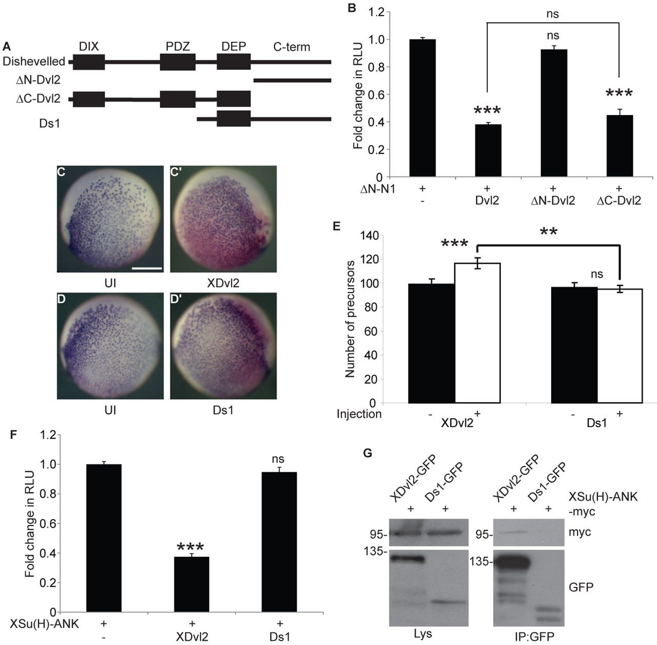 Fig. 6. Dishevelled DIX and PDZ domains are required for inhibition of RBPJκ. (A) Schematic of the structure of Dishevelled and the deletion constructs used. (B) The C terminus of mDvl2 is not required for inhibition of RBPJκ activity. CHO-K1 cells were transfected with RBPJκ-Luc and pRL-CMV, and vectors encoding δN-mN1 and the mDvl2 constructs illustrated. Data are presented as mean fold change (±s.e.m.) in RLU relative to δN-mN1 alone. Both δC-mDvl2 and mDvl2, but not δN-mDvl2, inhibit Notch signalling (one-way ANOVA and Tukey's post-hoc test, nâ¥3). (C-E) XDvl2 but not Ds1 inhibits endogenous Notch signalling in vivo. Xenopus laevis embryos were injected in one blastomere of a two-cell embryo with mRNA encoding β-gal and XDvl2 (C,Câ²) or β-gal and Ds1 (D,Dâ²). Ciliated cell precursors were detected by α-tubulin expression and the injected side was determined by X-Gal staining. Images of the uninjected (UI) and injected sides of the same embryo are shown. (E) Ciliated cell precursors were quantified as in Fig. 2D. Data are presented as the mean number of precursors counted (±s.e.m.). XDvl2 significantly increased ciliated cell precursor specification but Ds1 did not (two-tailed paired t-test). XDvl2 also increased precursor specification compared with Ds1 (two-way ANOVA and Bonferroni's post-hoc test). (F) Ds1 does not inhibit XSu(H) activity. CHO-K1 cells were transfected with NRE Su(H)-Luc and pRL-CMV, and vectors encoding XSu(H)-ANK, XDvl2 or Ds1. Data are presented as mean fold change (±s.e.m.) in RLU relative to XSu(H)-ANK alone (one-way ANOVA and Tukey's post-hoc test, n=3). (G) Ds1 shows greatly reduced XSu(H) binding. CHO-K1 cells expressing XSu(H)-ANK-myc and XDvl2-GFP or Ds1-GFP were subjected to immunoprecipitation using GFP-Trap beads. Immunoprecipitation samples were analysed by immunoblotting for myc and GFP, alongside total lysates. Positions of molecular weight markers (in kDa) are shown. Scale bar: 500 μm. **P<0.01; ***P<0.001; ns, P>0.05. |