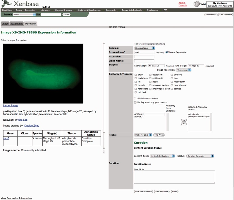 Figure 1. The Xenbase gene expression annotation interface. An image, or panel of images is loaded. After selecting the species and developmental stage, common anatomical terms appropriate for this stage range are loaded. If a term needed, in this example, otic placode, does not appear, the curator types the term in the ‘anatomy Item(s)’ text field. Once three letters have been typed AJAX generates a list of suggestions that the curator then selects from and the ID appended to the image. Often element names corresponding to adult structures are used by authors, for example kidney, rather than the stage appropriate name for the item at the time it is shown, which in an early embryo may be ‘pronephric mesenchyme' as in this example. The system enforces correct stage appropriate term usage.