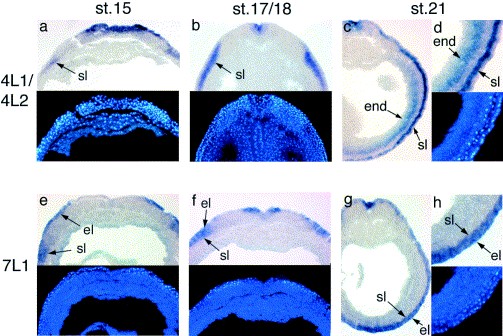 Fig. 4. Expression of Xenopus claudin genes examined by transverse sections of embryos. Expression of either Claudin-4L1 or -4L2 was shown, because Claudin-4L1 and -4L2 showed similar expression patterns. (a) claudin-4L1 at stage 15. (b) claudin-4L2 at stage 17/18. (c) claudin-4L2 at stage 21. (eâg) claudin-7L1 at stage 15 (e), stage 17/18 (f), and stage 21 (g). (d,h) Enlargement of the ventral region of c and g, respectively. Dorsal is up. Upper panels, bright field; lower panels, DAPI staining. el, epithelial layer of epidermal ectoderm; end, endoderm; sl, sensorial layer of epidermal ectoderm.