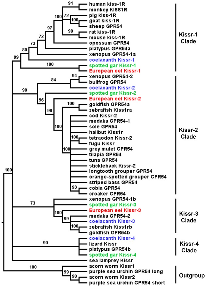 Figure 2. Consensus phylogenetic tree of the vertebrate kisspeptin receptors (Kissr).This phylogenetic tree was constructed based on the amino-acid sequences of Kissr (for the references of each sequence see Table S2) using the Maximum Likelihood method with 1,000 bootstrap replicates. The number shown at each branch node indicates the bootstrap value (%); only values and branching above 70% are indicated. The tree was rooted using the two sequences of the hemichordata acorn worm GPR54-1 and GPR54-2 and the two sequences of echinodermata purple sea urchin Kissr_short and Kissr_long. The European eel Kissr and predicted coelacanth and spotted gar Kissr are coloured in red, blue and green, respectively.