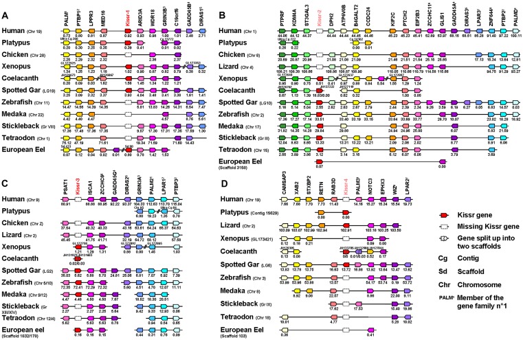 Figure 3. Conserved genomic synteny of osteichthyan Kissr.Genomic synteny maps comparing the orthologs of Kissr-1 (A), Kissr-2 (B), Kissr-3 (C), Kissr-4 (D) loci and their neighbouring genes. Analyses were performed on the genomes of human (Homo sapiens), platypus (Ornithorhynchus anatinus), lizard (Anolis carolinensis), chicken (Gallus gallus), xenopus (Xenopus (Silurana) tropicalis), coelacanth (Latimeria chalumnae), spotted gar (Lepisosteus oculatus), zebrafish (Danio rerio), medaka (Oryzias latipes), stickleback (Gasterosteus aculeatus), tetraodon (Tetraodon nigroviridis) and European eel (Anguilla anguilla). This map was established using the PhyloView of Genomicus v67.01 web site, manual annotation of European eel genome using CLC DNA Workbench 6 software and the gene annotation of the coelacanth and spotted gar genomic databases (see section 2). Kissr genes are named according to our proposed nomenclature (Kissr-1 to Kissr-4). The other genes are named after their human orthologs according to Human Genome Naming Consortium (HGNC). Orthologs of each gene are shown in the same color. Each of the eight conserved gene families is identified by an exponent number. The direction of arrows indicates the gene orientation, with the position of the gene (in 10−6 base pairs) indicated below. The full gene names and detailed genomic locations are given in Table S3.