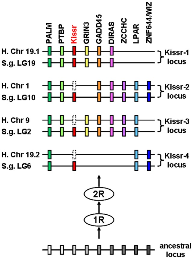 Figure 4. Proposed origin of osteichthyans Kissr loci based on human and spotted gar Kissr tetra-paralogons.The paralogous genes of each of the eight identified families delineate four tetra-paralogons in both human and spotted gar. This suggests a common origin of the four loci before the two whole genome duplication rounds (1R and 2R) occurred in the early vertebrate history.