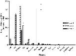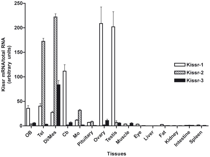 Figure 6. Tissue distribution of the expression of the three eel Kissr mRNAs.Olfactory bulbs (OB), telencephalon (Tel), di-/mes-encephalon (Di/Mes), cerebellum (Cb), medulla oblongata (MO), pituitary, ovary, testis, muscle, eye, liver, adipose tissue (Fat), kidney, intestine and spleen. The relative expression of each Kissr mRNA was normalised to the amount of total RNA. Each bar represents mean ± SEM from 8 individuals.