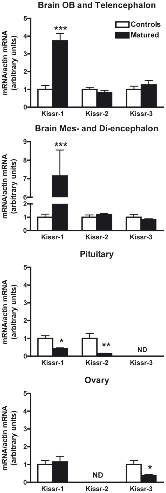 Figure 7. Regulations of the three eel Kissr expressions during experimental maturation.The relative expression of each Kissr mRNA was normalised to ß-actin mRNA. Each bar represents mean ± SEM from 7 control and 9 matured female eels. Significant difference between control and matured groups: *P<0.05, **P<0.01 and *** P<0.001 (Student's t test). N.D. = Non detectable.