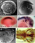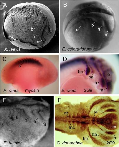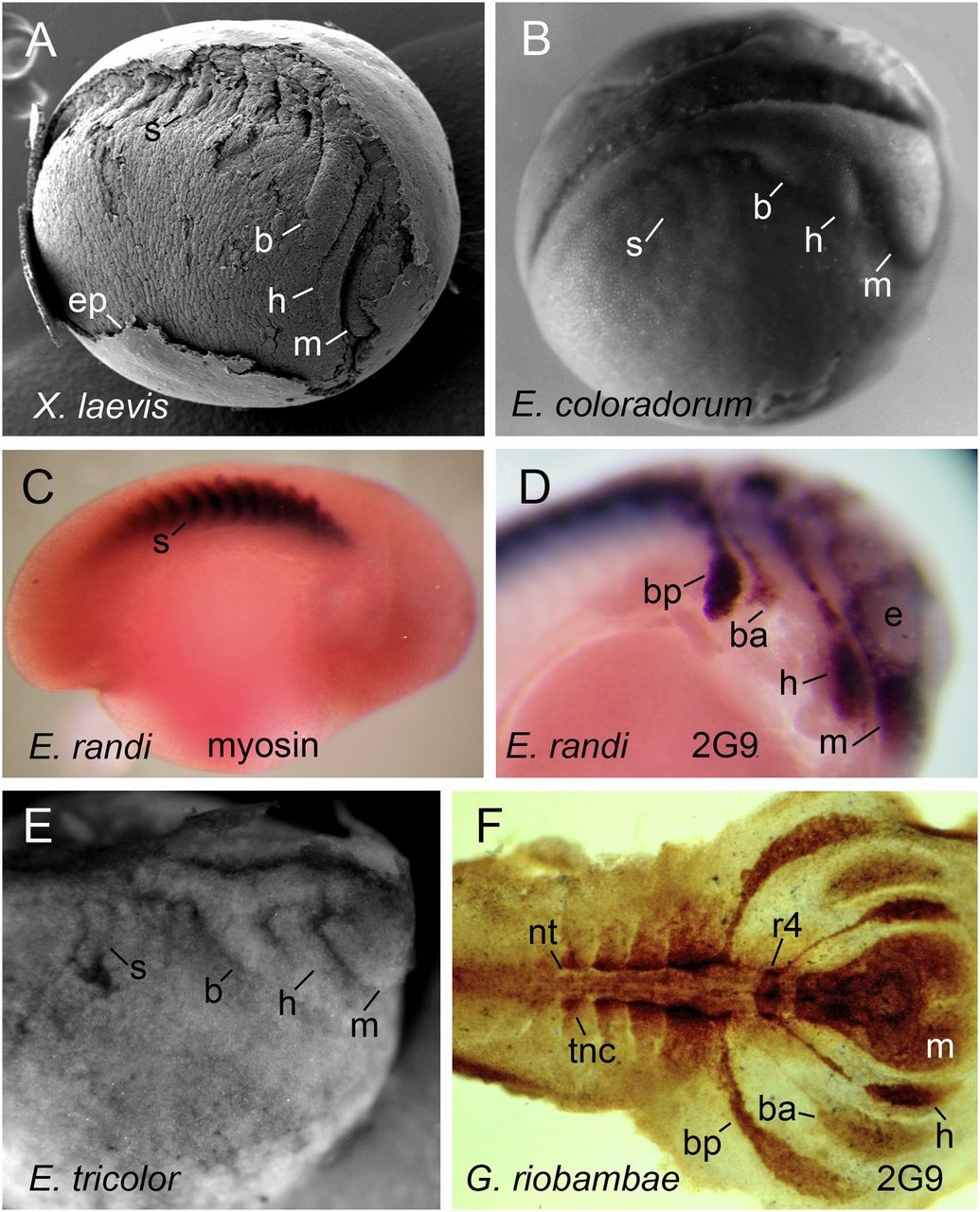 Fig. 2. Somite and neural characteristics of frog embryos. In all images the head is oriented toward the right. The dorsal side is toward the top in AâE. The epidermis of embryos in A, B, and E was partially removed. (AâD) Embryos of rapidly developing frogs. (A) Scanning electron micrograph of a X. laevis neurula with seven somites and closed neural folds. Three streams of cranial neural crest are visible. (B) Light micrograph of an E. coloradorum embryo. This embryo had open neural folds, four somites, and three streams of cranial neural crest. (C) Tailbudembryo of E. randi immunostained for sarcomeric meromyosin, labeled as myosin in the image. The 12 most rostral somites gave a positive signal. Sarcomeric meromyosin was not detected in the recently formed somites of the caudal region and in the presomitic mesoderm. (D) The cranial neural crest streams of a tailbudembryo of E. randi immunostained for antigen 2G9. The four streams of cranial neural crest gave a 2G9-positive signal. Another micrograph of this embryo was published in ref. 15. (E and F) Embryos of slowly developing frogs. (E) Light micrograph of an E. tricolor embryo. This embryo had four somites and three streams of cranial neural crest, as in the embryo of E. coloradorum shown in B. In contrast, the neural folds are in contact in the slowly developing embryo of E. tricolor and open in the rapidly developing embryo of E. coloradorum. (F) Dorsal view of a G. riobambae embryo with five to six somites that was removed from the yolky endoderm and immunostained for antigen 2G9. In this embryo, the neural folds were closed, and four streams of cranial neural crest were visible. The cranial and trunk neural crest, the neural tube, rhombomeres 1â2, and rhombomere 4 are 2G9-positive as described by ref. 43. ba, branchial anterior stream of cranial neural crest; bp, branchial posterior stream of cranial neural crest; nt, neural tube; r4, rhombomere 4; tnc, trunk neural crest; other abbreviations as in Fig. 1.