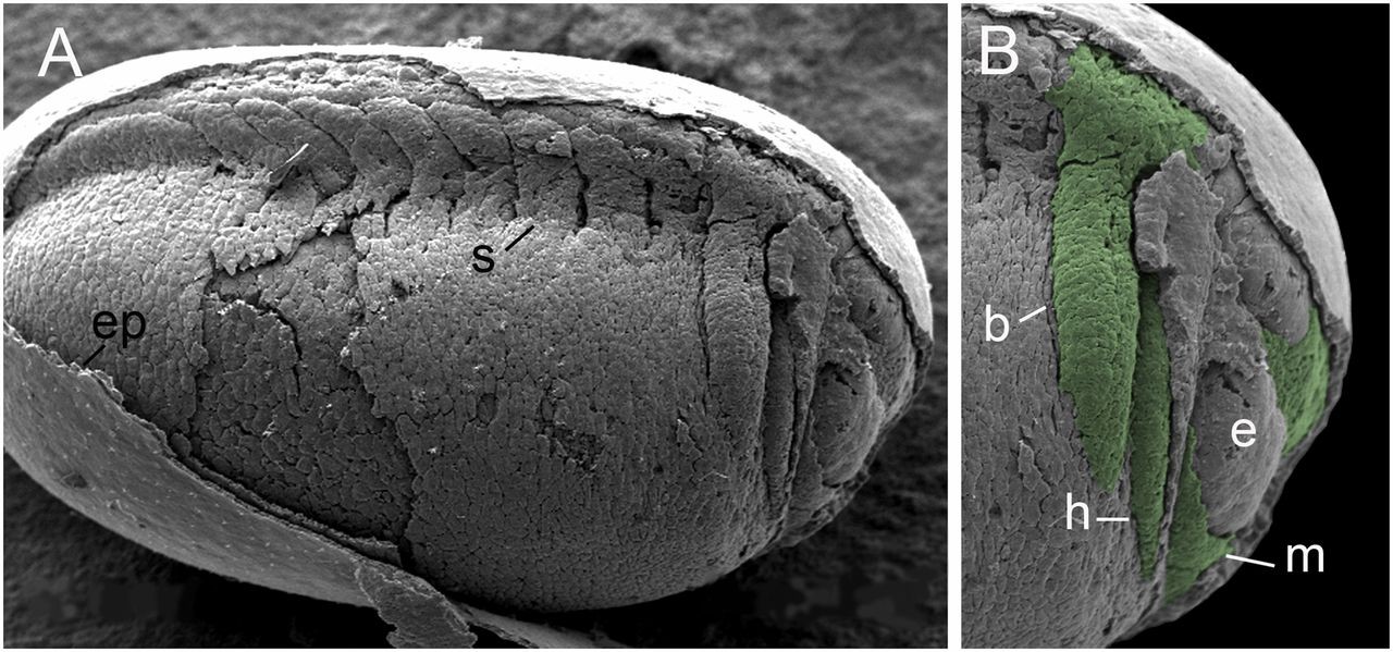 Fig. 1. Somites and neural structures in embryos of X. laevis. (A) Scanning electron micrograph of a X. laevis embryo with the epidermis partially removed. The neural folds are in contact. The embryo has eight somites and three streams of cranial neural crest. The head is oriented toward the right, and the dorsal side is toward the top. (B) Pseudo-colored electron micrograph of the embryo shown in A at higher magnification to highlight the streams of cranial neural crest. The optic vesicle divides the mandibular stream in two portions. b, branchial stream of cranial neural crest; e, optic vesicle; ep, epidermis; h, hyoid stream of cranial neural crest; m, mandibular stream of cranial neural crest; s, somite.