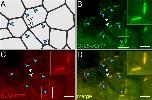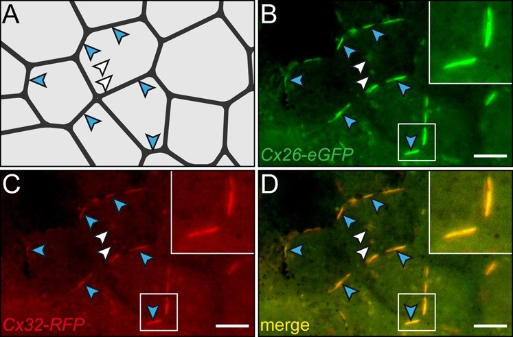 Fig 3. Cx26 and Cx32 form heteromeric connexons in Xenopus embryos. Fusion constructs (Cx26-eGFP and Cx32-RFP) were co-injected into the animal region of single blastomeres at the 4-8 cell stage and cultured through blastula-gastrula stages. Fluorescent fusion proteins were co-expressed in ectodermal cells of the animal cap region. Expression was found in vesicles (white arrowheads) and the plasma membrane (blue arrowheads). (A) Cell boundaries. Positions highlighted in (B) are indicated by arrowheads. (B) Cx26-eGFP staining. (C) Cx32-RFP staining. (D) Overlay of frames. Scale bar represents 10 . |