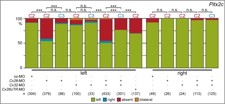 Fig 5. Cx26 but not Cx32 is required for LR development. Lineage and side-specific knockdown of Cx26 and Cx32 alone or in combination as specified, followed by Pitx2c expression analysis in morphant tadpoles. Injections were targeted to the C2 lineage, i.e. the somitic GRP cells and the adjacent endodermal cells, or to the C3 lineage, i.e. more lateral endodermal cells (Fig. 4A,A′). Note that Cx32 knockdown did not affect Pitx2c expression, and that Cx26 was only required on the left side. Note also two non-overlapping Cx26-MOs, which targeted the 5′-UTR and the start AUG, respectively, gave qualitatively identical results, confirming the specificity of the knockdown. Note further that targeting to the endodermal cells adjacent to the GRP (C2 lineage) resulted in highly significant disruption of Pitx2c expression, while effects were not significant in lateral endodermal cells (C3 lineage). Numbers represent number of embryos analyzed. Statistical significances were calculated using Pearson's chi square test. |