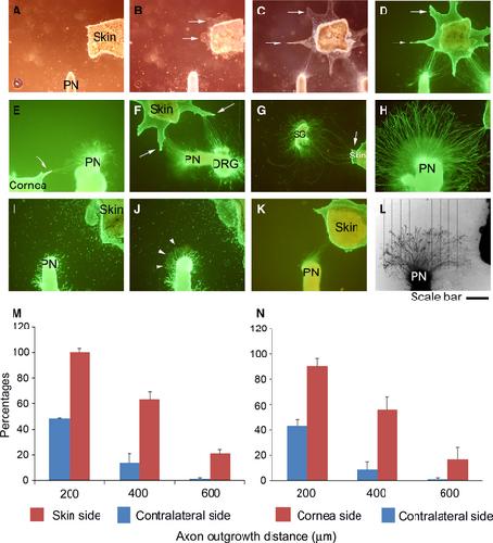 Figure 1. Regenerating axons grow towards epithelial cells migrating from skin explants in matrigel. Dark field images show cell migration from a skin explant and axonal outgrowth from the end of a peripheral nerve (PN) after (A) 1 day, (B) 2 days and (C) 3 days in culture. (D) Calcein-labelled image at 3 days. Axonal outgrowth increased rapidly after 2 days, and by 3 days had reached the migrating epithelial cells (arrows). C and D are of a slightly different field to A and B, to include axons from an adjacent PN-DRG growing towards the skin explant. Regenerating axons converged on the leading fronts of migrating cells from explants of cornea (E) and skin (F). Sympathetic ganglia (SG) axons also showed striking convergent axonal growth towards a skin explant (G). Axonal growth was attracted towards skin explants even in the presence of NT-4. Initial axon outgrowth from a PN-DRG preparation was radial, but, approximately 500 μm from the skin explant, axons began to grow towards a small area of migrating cells (H). Axonal growth towards skin explants also depends on gel composition. After 3 days culture in a fibrin gel, a PN-DRG showed some cell migration but no axonal outgrowth towards a skin explant (I), although abundant axonal outgrowth (arrows) occurred 1 day after addition of BDNF (J). In lamininidogen complex gels, directed axonal outgrowth towards skin explants occurred within 3 days (K). Bar: 500 μm in A and H; 1000 μm in G. To quantify the effects of skin and cornea on axonal growth from PN-DRGs, calcein-AM fluorescence images were first inverted to facilitate visualization of individual axons (L). Lines were then drawn on either side and parallel to the end of the cut peripheral nerve, and the proportions of axons extending 200 μm, 400 μm and 600 μm from the end of the nerve were determined as percentages of the numbers of axons initially growing from the end of the nerve on both sides. The lower panels show percentages of axons (as proportions of the numbers initially growing from the cut end of the peripheral nerve) extending laterally to different distances on the side next to the skin (M) or cornea (N) as compared with the opposite side (three experiments). In M, the differences are significant at 200 μm, 400 μm and 600 μm (P < 0.001, P < 0.01 and P < 0.001, respectively), and in N they are significant at 200 μm and 400 μm (P < 0.005 and P < 0.02, respectively). |