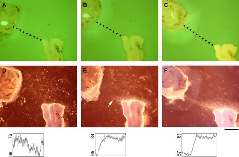 Figure 6. Fluorescence and dark field (upper and middle panels, respectively) images of a nodose ganglion and skin explant co-cultured in matrigel containing DQ gelatin, showing onset of axonal growth in relation to MMP activity. Fluorescence around the edges of the skin explants increased in intensity and extent from day 1 (A, D) to day 3 (C, F). No specific fluorescence was seen when DQ gelatin was omitted from the matrigel (data not shown). Plots of changes in fluorescence intensity (in arbitrary units) along a line between the skin and ganglion (dots) are shown in the lower panels. Axonal growth was already predominantly oriented (arrow in E) towards the skin explant on day 2, although the zone of MMP activity (B) had not yet extended to the tips of the growing axons. By day 3, axons had continued to extend through the area of MMP activity to make contact with migrating cells from the skin explants (F). Bar: 200 μm. |