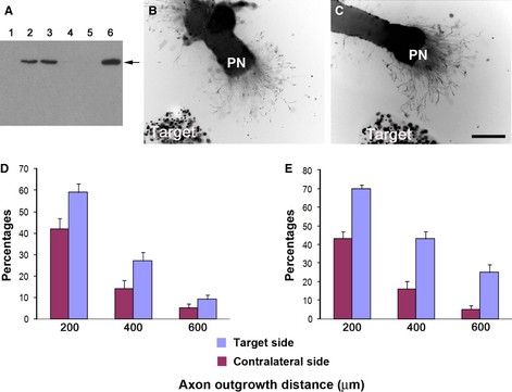 Figure 8. Forced expression of MMP-18 in COS-7 cells promotes axonal growth. (A) Western blot showing bands corresponding to the molecular mass of pro-MMP-18 in CM from COS-7 cells stably transfected with pro-MMP-18, concentrated eight-fold (lanes 2 and 3), but scarcely detectable in unconcentrated medium (lanes 4 and 5). These two pairs of lanes represent CM from replicate cultures. By contrast, pro-MMP-18 was readily detectable in unconcentrated skin explant CM (lane 6), indicating that its concentration was higher than in media conditioned by COS-7 cells. MMP-18 was not detected in concentrated media conditioned by COS-7 cells stably transfected with the empty vector (lane 1). (B and C) Co-cultures of PN-DRGs with COS-7 cells (target). In co-cultures with COS-7 cells transfected with empty vector, longer axonal outgrowth was seen (visualized by calcein-AM fluorescence and image inversion) from the end of the peripheral nerve (PN) adjacent to aggregates of the COS-7 cells than from the opposite side (B). However, the difference in axonal lengths was much more marked in co-cultures with COS-7 cells expressing MMP-18 (C). Bar: 200 μm. Lower panels: percentages of axons (as proportions of the numbers of axons initially growing from the cut end of the peripheral nerve) extending laterally to different distances on the target side (next to control COS-7 cells transfected with empty vector or COS-7 cells expressing pro-MMP-18) as compared with the contralateral side. Results from three independent experiments were pooled, and differences in percentages between target and contralateral sides at different distances from the COS-7 cells were compared by paired t-test. In cultures with the control COS-7 cells (D), significantly more axons extended towards the COS cells at 200 μm and 400 μm (P < 0.01 and P < 0.02, respectively), but not at 600 μm. By contrast, significantly more axons extended towards the COS cells expressing pro-MMP-18 (E) at all three distances measured (P < 0.001), indicating that these cells had a greater stimulatory effect on axonal outgrowth than the control COS-7 cells. The differences in gaps between the cut ends of the peripheral nerves and COS-7 cell aggregates transfected with pro-MMP-18 cDNA and empty vector (879 94 μm and 846 85 μm, respectively) were not significant. |