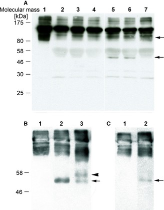 Figure 9. (A) Western blots demonstrating nidogen cleavage by MMPs released from cultured skin and cornea. In lane 1, where freshly diluted matrigel (100 ng) was applied, there are several high molecular mass bands (> 80 kDa), but no smaller breakdown products are visible. By contrast, in lanes 2, containing media conditioned by polymerized matrigel without (lanes 2) or with (lanes 5) Xenopus skin explants for 3 days, there are several lower molecular mass bands (280 kDa), and fragments of 50 kDa and 90 kDa (arrows) are observed in samples incubated with Xenopus skin explants (lanes 5 and 6), but are absent from BB-94-treated cultures (lane 7). In lanes 2/5 and 3/6, samples are from two independent experiments. (B) Media conditioned by lamininidogen gels containing skin explants (lanes 1 and 2) or cornea explants (lane 3). Note the absence of the 50-kDa band (arrow) in CM from a BB-94-treated culture (lane 1). In media conditioned by cornea in lamininidogen complex gels, there is an additional nidogen fragment of 57 kDa, marked by an arrowhead. (C) Diluted lamininidogen complex (100 ng/μL) incubated with cell culture supernatants from COS7 cells transfected with empty vector (lane 1) or an MMP-18 expression vector (lane 2). The arrow marks the position of the cleaved nidogen band (50 kDa). |