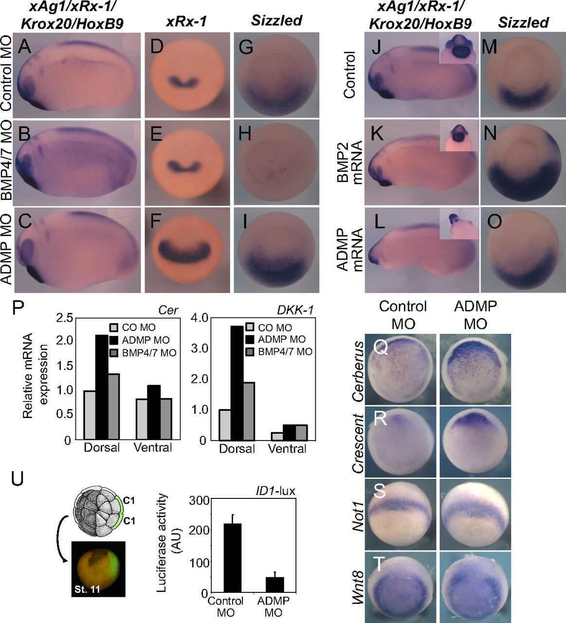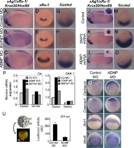 were coinjected with control or ADMP morpholinos. In D, embryos were injected in the animal pole with ID1-luciferase reporter alone (Control) or in