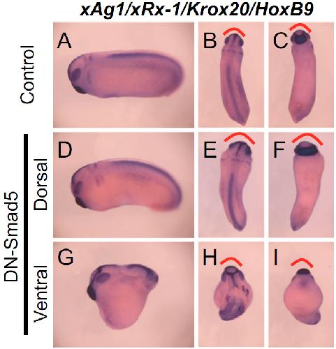 Fig. S2. (A) Embryos were injected with dominant-negative Smad5 mRNA (DN-Smad5; 100 pg/embryo) into the marginal zone of dorsal (D) or ventral G) blastomeres at the four-cell stage and expression pattern of neural genes (xAg1, xRx-1, Krox20, and HoxB9) were visualized by in situ hybridization at tail bud stage. Note that the anterior structure is expanded in dorsally injected embryos (red brackets). (A, D, and G) Lateral view. (B, E, and H) Dorsal view. (C, F, and I) Ventral view. Pictures are the representatives of >20 embryos from two independent experiments. Frequency of the shown phenotype was >85%. |