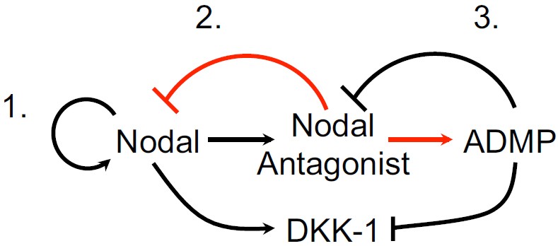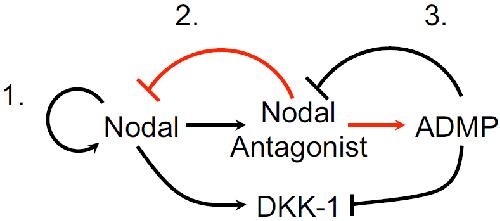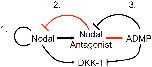 between Nodal and Nodal antagonists (1). (3) As described in this paper, Nodal antagonists facilitate ADMP signaling that, in turn, negative feedbacks on their