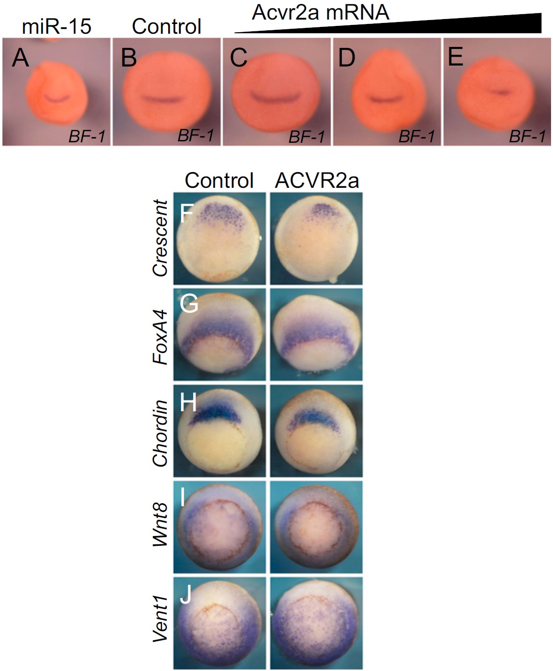 Fig. S3. (A) BF-1 expression of the embryos injected as Fig. 3 B and harvested at early neurula stage. Numbers of embryo n > 18, frequency of the shown phenotype >70%. (F) Expression at gastrula stage of the indicated markers of embryos radially injected with ACVR2a (100 pg) mRNA. |