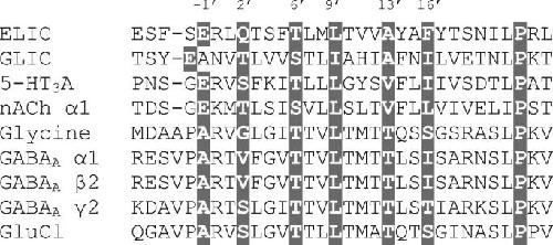 Fig. 1. An alignment of channel-lining residues for a range of eukaryotic Cys-loop receptors and prokaryotic homologues. As is common for these receptors, a prime notation is used to facilitate comparison between different subunits, with 0′ being the conserved charged residue at the start of M2. Grey indicates residue conservation. Accession numbers are: ELIC P0C7B7, GLIC Q7NDN8, 5-HT3P46098, nACh α1 P02708, Gly P23415, GABAA α1 P14867, GABAA β2 P47870, GABAA γ2 P18507, GluCl Q94900.