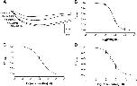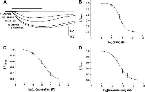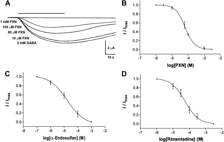 Fig. 3. ELIC antagonists. (A) Example traces showing inhibition by picrotoxinin (PXN). Concentration–inhibition curves for PXN (B), α-endosulfan (C), and rimantadine (D). Inhibition was measured at the GABA EC50 (1.6 mM). Data = mean ± SEM, n ≥ 4. Values derived from the curves can be found in Table 2.
