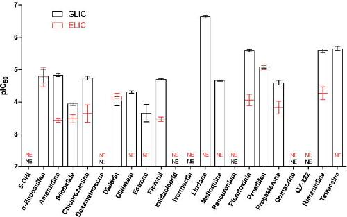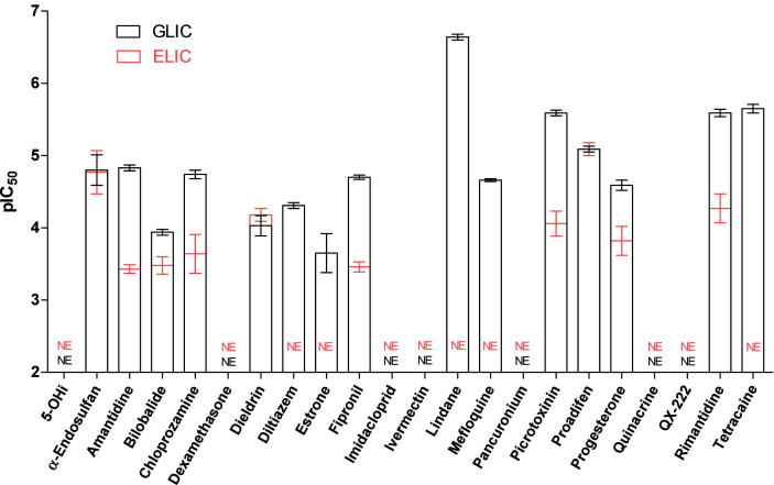 Fig. 5. Comparison of pIC50 values from ELIC with those previously reported at GLIC (Alqazzaz et al., 2011). Compounds are almost all less potent at ELIC and fewer compounds inhibit responses.