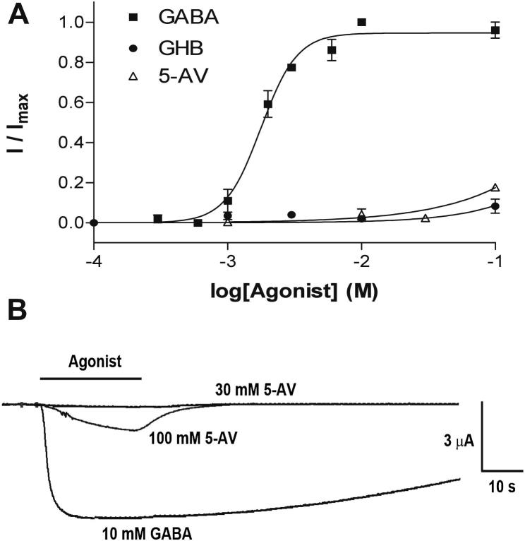 Fig. 2. GABA and 5-AV agonist concentration–response curves (A) and example responses (B). The black bar is the application of agonist. Data = mean ± SEM, n ≥ 4.