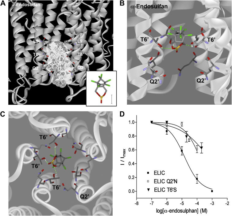 Fig. 4. (A) An overlay of all 10 docked poses for α-endosulfan. The channel volume occupied by 10 poses are calculated from the Van der Waals radii and are shown in wireframe. Inset Structure of α-endosulfan. Scale = 2.5 Å. (B) A single pose showing the channel from the side. There are hydrogen bond interactions with 6′ Thr residues from adjacent subunits. (C) The same pose is seen from above, looking down towards the cell intererior. (D) Concentration response curves show Q2′N and T6'S mutations caused a decrease in α-endosulfan potency.
