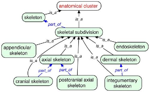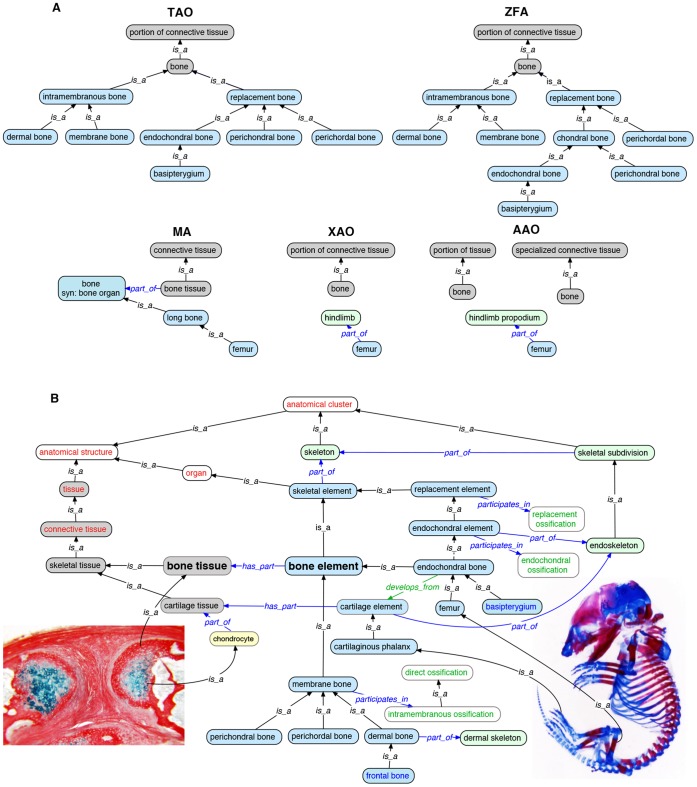Figure 4. Representation of the skeleton in vertebrate anatomy ontologies.The vertebrate skeleton can be partitioned according to many different criteria – and it had been by the different groups (Table 1) that developed anatomy ontologies. For example (A), ‘bone’ had been treated as a type of tissue by all except the MA, who also related it to the concept of ‘bone organ’. In the VSAO (B), the concepts of bone tissue and bone element were disentangled, named and defined. Individual bone elements were related to their tissue and cell components as well as developmental processes. From these links one can reason that, e.g., the ‘femur’ is part_of ‘endoskeleton’, develops_from ‘cartilage element’, and participates_in the process of ‘endochondral ossification’, whereas the ‘frontal bone’ is part_of ‘dermal skeleton’ and participates_in the process of ‘direct ossification’. Image on left shows chondrocytes embedded in a bone matrix developed from periosteum of fractured chick dermal bone. Image on right shows a late gestational stage mouse embryo stained with alcian blue and alizarin red. CL term is shown in yellow fill, tissue terms in grey fill, skeletal element terms in blue fill, and skeletal subdivision terms in green fill. Parent classes from CARO are in red font, GO terms in green font, TAO terms in blue font, and VSAO terms in black font.