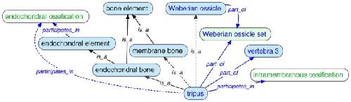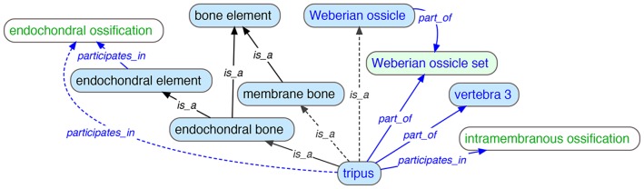 Figure 6. Representation of a skeletal element with multiple classification criteria.The ‘tripus’ is directly asserted (solid lines) to be a type of ‘endochondral bone’, part_of the ‘Weberian ossicle set’, part_of ‘vertebra 3′ and to form through the process of (‘participates_in’) ‘intramembranous ossification’. The reasoner infers (dotted lines) the tripus to be a type of ‘membrane bone’ and a ‘Weberian ossicle’, and infers it to participate in ‘endochondral ossification’. Skeletal element terms are shown in blue fill, skeletal subdivision term in green fill, TAO terms in blue font, VSAO terms in black font, and GO process terms in green font.