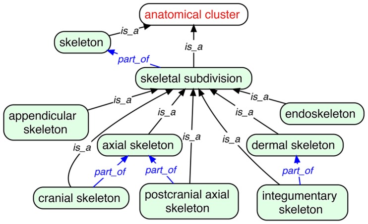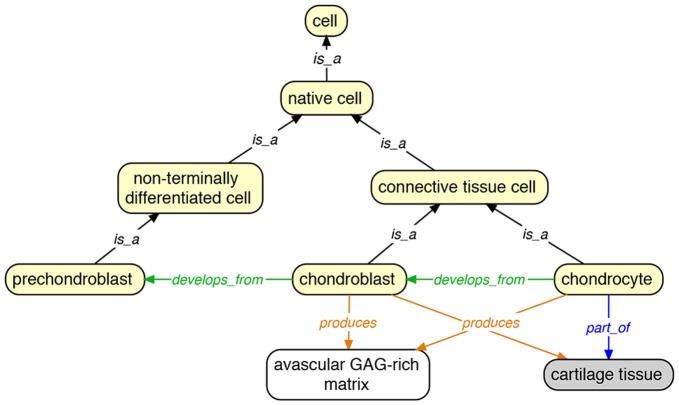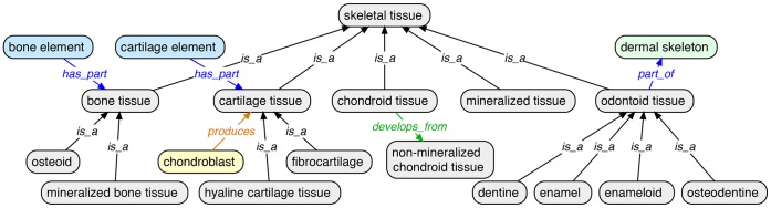 Figure 3. Some skeletal tissues in the VSAO and selected relationships to other tissues, cells, and skeletal elements.CL terms are shown in yellow fill, tissue terms in grey fill, skeletal element terms in blue fill, and skeletal subdivision terms in green fill.