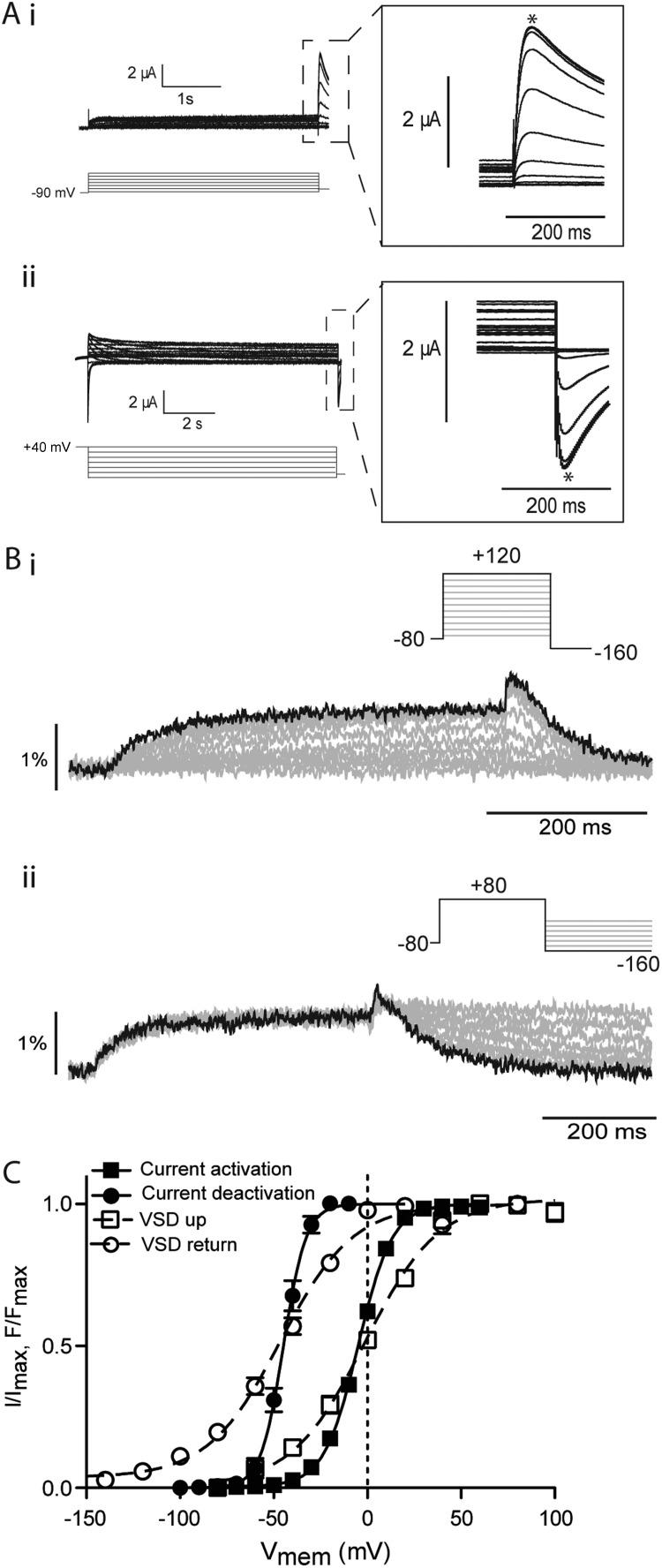 Figure 2. Effect of N-terminal truncation on mode shift of hERG channels. (A) Example traces recorded in response to protocols shown to measure the voltage-dependent equilibria of activation (i) and deactivation (ii) of Δ2–25 hERG channels. Insets are expansions of the highlighted regions. Peak currents were measured at the points marked with asterisks. (B) Example fluorescent traces recorded using voltage-clamp fluorometry in response to the protocols shown to measure activation/upward motion (i) and return (ii) of the VSD of Δ2–25 hERG. (C) Summary of voltage dependence of equilibria of activation and deactivation. Solid lines are fits of the Boltzmann equation to current data, whereas broken lines are fits of the Boltzmann equation to the fluorescent data. V0.5 values were 2 ± 0.3 mV and −10 ± 0.4 mV for current activation and deactivation, respectively (SEM; n = 7). V0.5 values were measured as 0 ± 1 mV (SEM; n = 8) and −43 ± 7 mV (SEM; n = 11) for activation and return of the VSD, respectively.