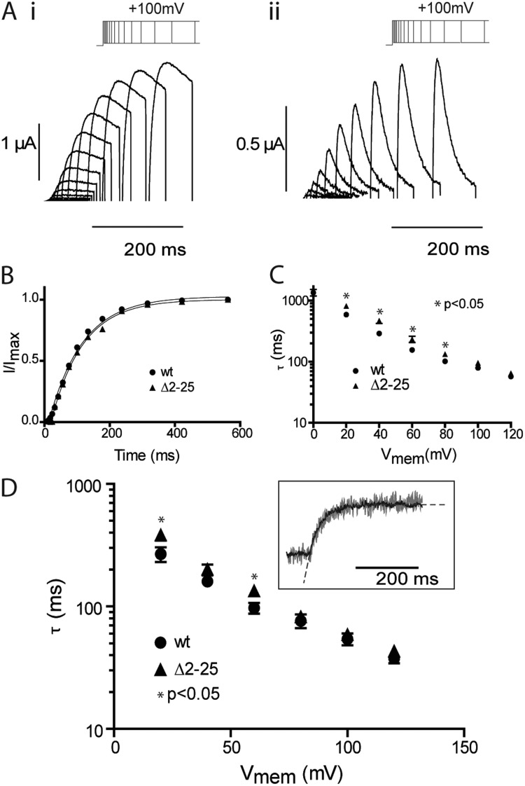 Figure 3. Effect of N-terminal truncation on kinetics of hERG activation. (A) Typical examples of currents recorded in response to the envelope of tails protocols shown for E518C (i) and Δ2–25 (ii) hERG channels. In these examples, the activating potential was 100 mV. (B) Peak tail currents plotted against the duration of the activating pulse for the examples shown in A. The black line is a fit of a single exponential to the activation time course. (C) Summary of the voltage dependence of rates of activation of ionic current. Error bars are SEM; n ≥ 8. (D) Summary of the voltage dependence of the rates of VSD activation/upward motion derived from single exponential fits to the fluorescent time course using the same protocol illustrated in Fig. 1 B (i). Error bars are SEM; n ≥ 7. The inset shows example fits to fluorescent traces from MTSR-labeled E518C recorded at 100 mV.