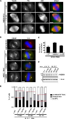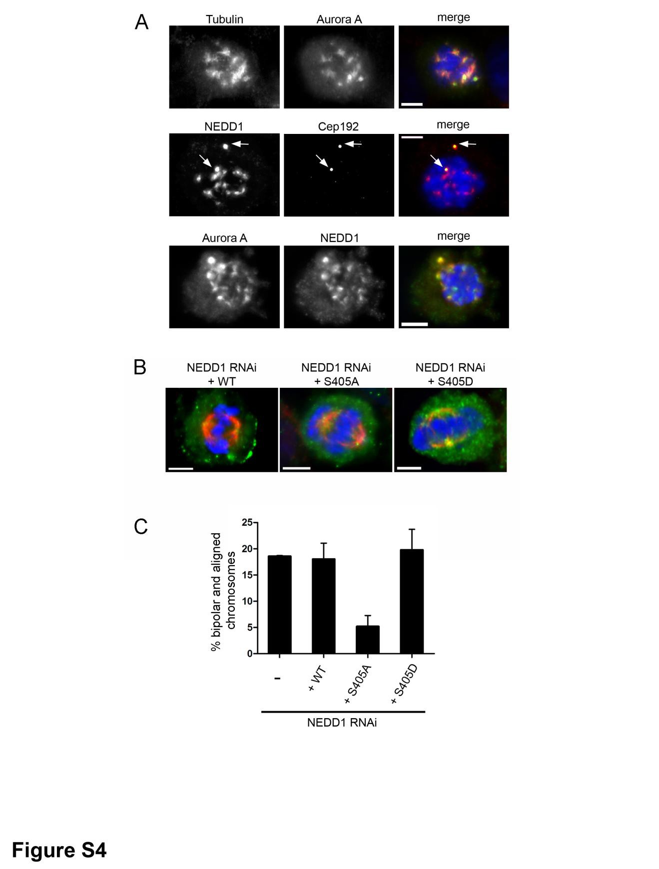 (B) NEDD1 phosphorylation at Ser405 is essential for chromosome alignment. Representative images of NEDD1 silenced Hela cells incubated in nocodazole and fixed 45 min after nocodazole washout. Cells expressing Flag-hNEDD1 S405A showed a strong chromosome misalignment phenotype. MTs are shown in red, the Flag-hNEDD1 proteins (as detected with anti-Flag antibodies) in green and DNA in blue. Scale bar 5 μm.