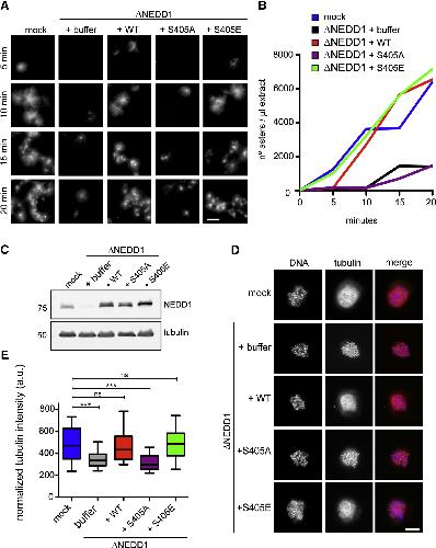 Figure 4. NEDD1 Ser405 Phosphorylation Is Essential for Chromatin- and RanGTP-Dependent MT Nucleation in Xenopus laevis Egg Extracts(A) RanGTP asters formed in control mock-depleted egg extract (mock), NEDD1-depleted extract (+buffer), and depleted extract supplemented with human recombinant flag-NEDD1 (WT), Flag-NEDD1 S405A (+S405A), or Flag-NEDD1 S405E (+S405E). The images correspond to squashes taken at 5, 10, 15, and 20 min after RanGTP addition to a CSF extract. MTs are visualized by addition of rhodamine tubulin to the extract. Scale bar represents 25 μm.(B) Quantification of the number of RanGTP asters in each experimental condition. The graph shows one representative experiment out of four independent experiments.(C) Western blot analysis of the extracts used for (A) and (B) showing that endogenous NEDD1 in mock extract was efficiently depleted, and showing the different recombinant proteins that were added to the depleted extract. The tubulin signal is shown as loading control.(D) Images of DNA-coated beads incubated in cycled extract as indicated for 30 min. Rhodamine tubulin was added to the extract for visualization. DNA was stained with Hoechst. Note that the beads are autofluorescent. Scale bar represents 25μm.(E) Quantification of the DNA bead-dependent MT nucleation shown in (D). The total tubulin intensity around each DNA bead cluster was measured and normalized by the cluster size. In the box-and-whiskers plot, boxes show the upper and lower quartiles (25%5%) with a line at the median. ∗∗∗p < 0.005; ns, no statistical difference using Student t test. The graph shows one of two independent experiments.
