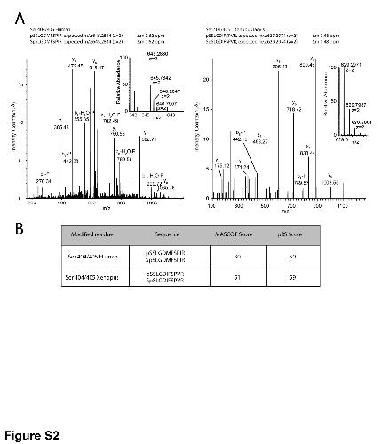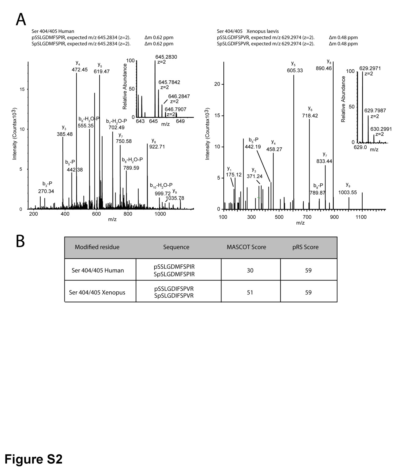 (A) Representative MS/MS spectra of the identified phosphorylated peptides for the human and X. laevis NEDD1. Flag-NEDD1 was expressed in HeLa cells and pulled down with anti-Flag coated beads from lysates of cells synchronized in mitosis. Endogenous NEDD1 was immunoprecipitated from CSF arrested Xenopus egg extracts.