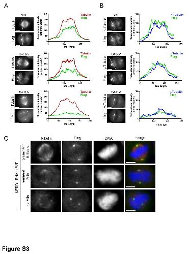 (A) Quantification of the tubulin and Flag fluorescence signal along the width of spindles assembled in NEDD1 silenced Hela cells expressing Flag-hNEDD1 WT (WT), Flag-hNEDD1 S405A (S405A) or Flag-hNEDD1 S411A (S411A) corresponding to the experiment shown in Figure 2A. The fluorescence signal intensity of tubulin (red lines) and the different Flag-tagged NEDD1 variants (green lines) were quantified along the lines across the half spindles (as indicated) using the lot Profilefunction of ImageJ software. The fluorescence intensities were plotted as a function of the line length. Flag-NEDD1 wt and Flag-NEDD1 405A localize to the spindle MTs whereas Flag-NEDD1 411A does not, as previously described [8]. Scale bars, 5 μm.